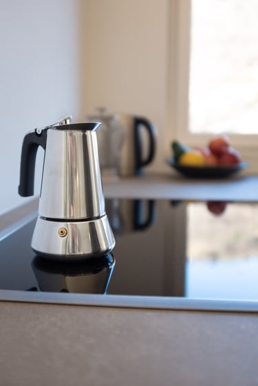 Voll ausgestattete Küche mit Induktionskochfeld, Backofen, Geschirrspüler, Kühlschrank, Wasserkocher, French Press & Mokkakanne, Milchschäumer