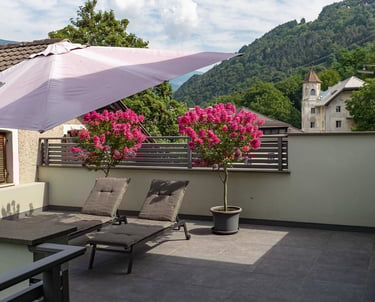 Die große Panorama-Terrasse ist das Herzstück dieses Penthouse Apartments und erweitert den Wohnraum ins Freie. Sie bietet einen 360° Rundumblick mit sonnigen Plätzen und schattigen Rückzugsorten zum Entspannen.